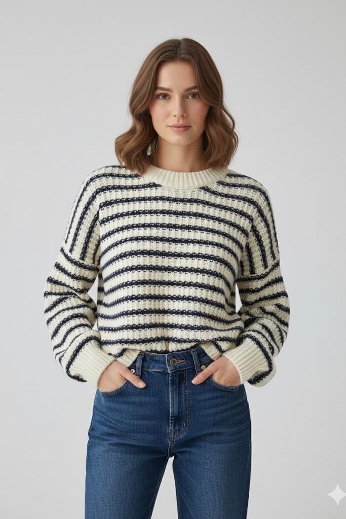 Bisiklet Yaka,Siyah Ekru Lacivert Çizgili Kazak