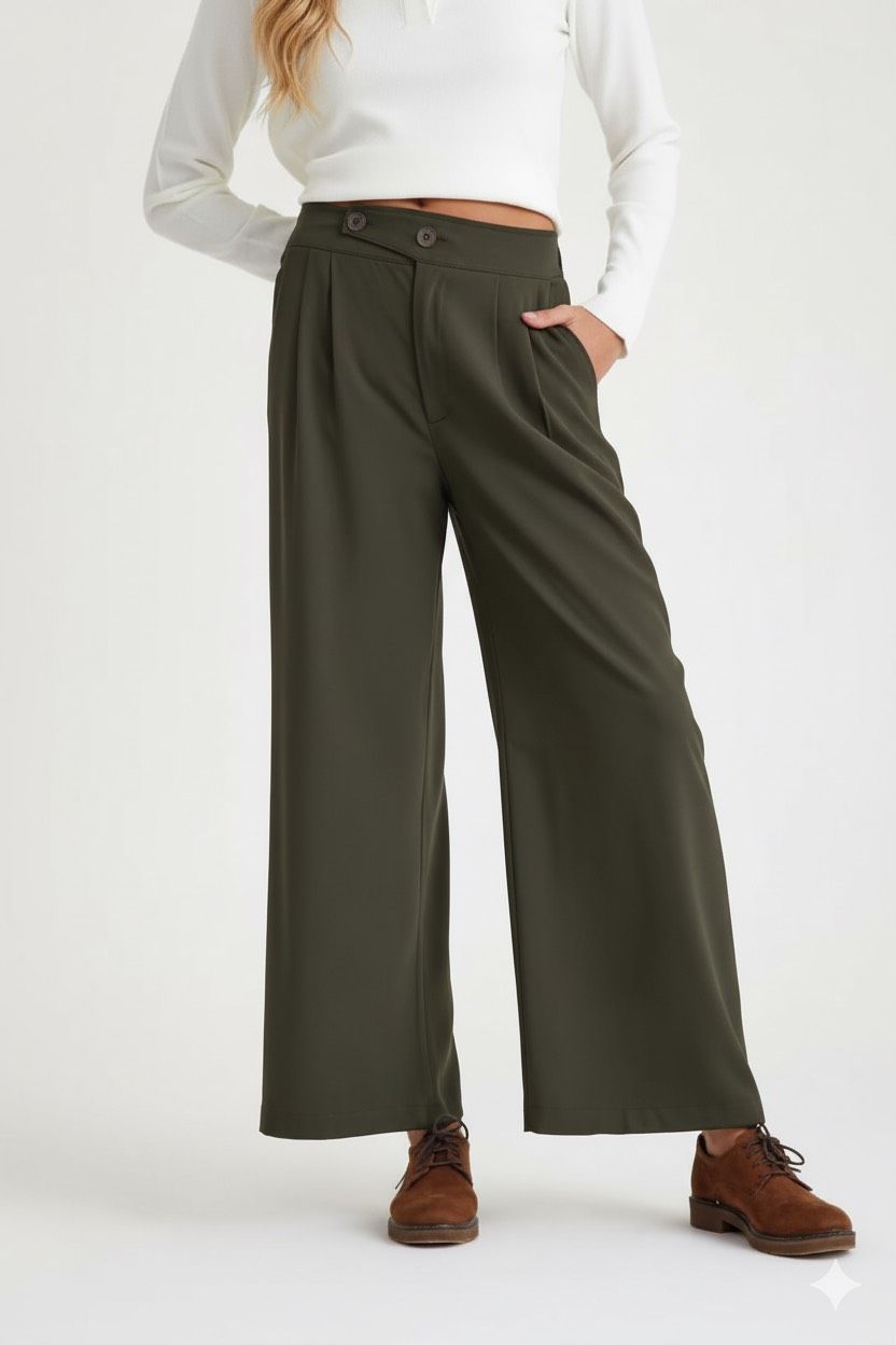 Ön Kemeri Asimetrik Detaylı, Arka Beli Lastikli, Cepli, Önü Fermuarlı ve Pilili Pantolon