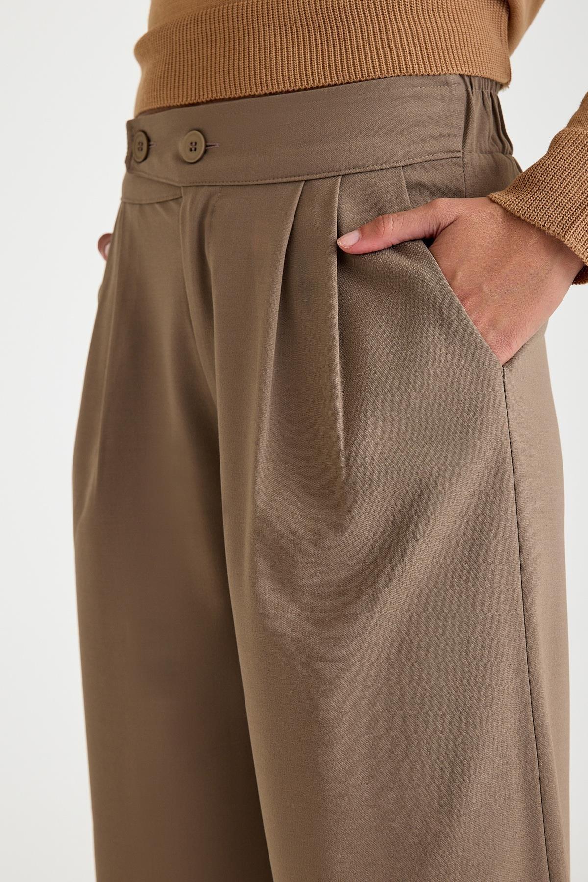 Ön Kemeri Asimetrik Detaylı, Arka Beli Lastikli, Cepli, Önü Fermuarlı ve Pilili Pantolon.