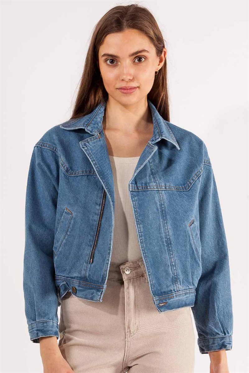 Düşük Kol, Yanlardan Ayarlanabilir metal Tokalı, Fermuarlı, Kısa Kot Ceket. Kumaş İçeriği: %100 Pamuk