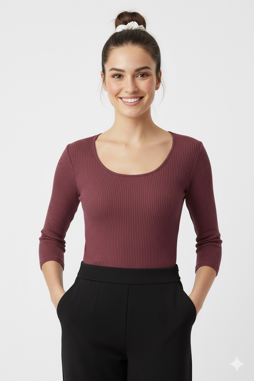 Oval Yaka Tişört-Mürdüm