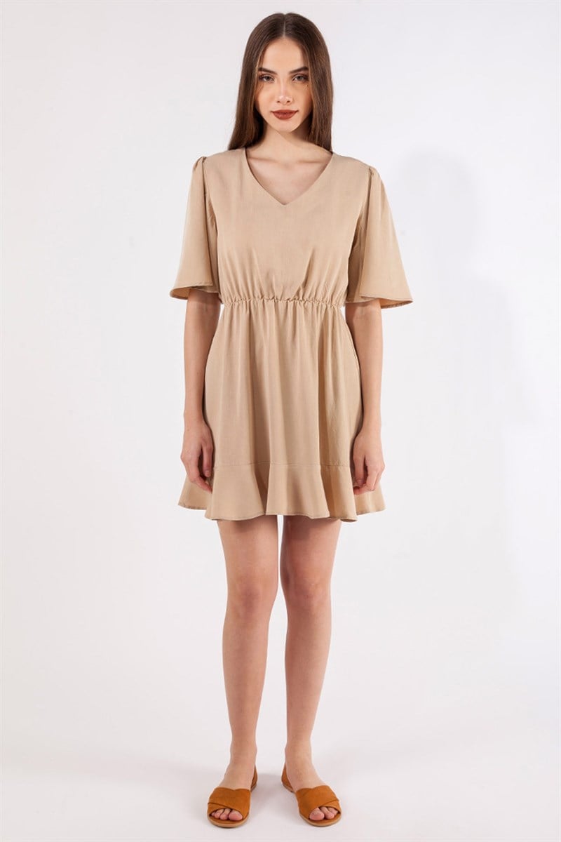 Beli Lastikli, Kolları Volanlı, Eteği Fırfırlı Elbise. Kumaş İçeriği: %100 Pamuk